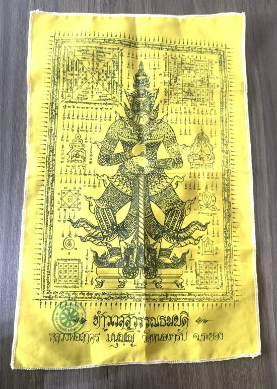 ผ้ายันต์เหลืองท้าวเวสสุวรรณธนบดี หลวงพ่อสาคร มนุญโญ วัดหนองกรับ ขนาดประมาณ 12 x 18 นิ้ว |