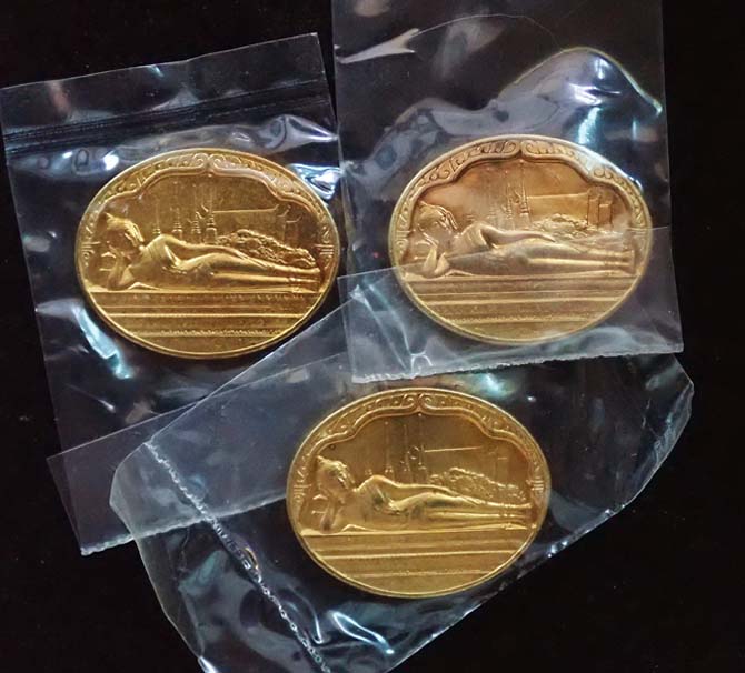 3เหรียญพร้อมกัน !!!!!! เหรียญพระไสยาสน์ หลังภปร. ปี๒๕๓๐ ในหลวงเฉลิมพระชนมพรรษาครบ ๕ รอบ เนื้อบรอนซ์กะไหล่ทอง บล๊อกกองกษาปณ์ สวยมาก..ซองพลาสติกเดิมๆ
