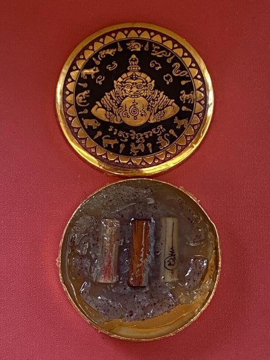 เคาะเดียวแดง สีผึ้งพระราหู รุ่น มงคลจักรวาล เนื้อ โลหะชุบทองลงยาสีดำขอบสีแดง ขนาด5ซม |