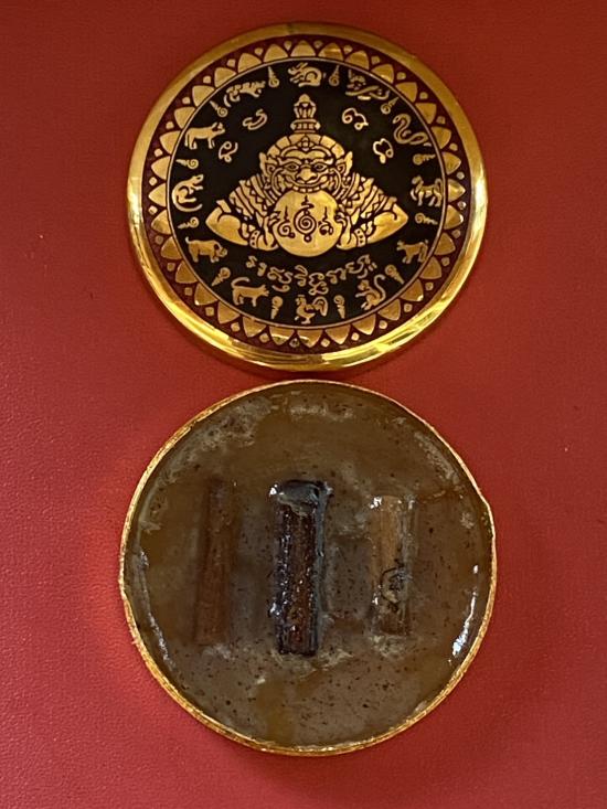 เคาะเดียวแดง สีผึ้งพระราหู รุ่น มงคลจักรวาล เนื้อ โลหะชุบทองลงยาสีดำขอบสีแดง ขนาด5ซม |