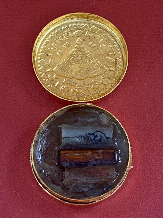 เคาะเดียวแดง สีผึ้งพระราหู รุ่น มงคลจักรวาล เนื้อ โลหะชุบทองลงยาสีแดงขอบสีน้ำเงิน ขนาด3.2ซม |