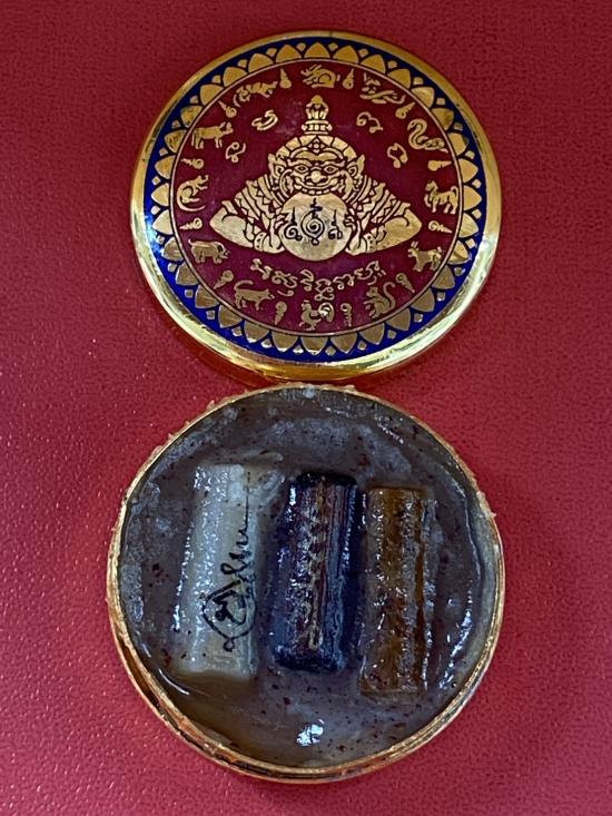 เคาะเดียวแดง สีผึ้งพระราหู รุ่น มงคลจักรวาล เนื้อ โลหะชุบทองลงยาสีแดงขอบสีน้ำเงิน ขนาด3.2ซม |