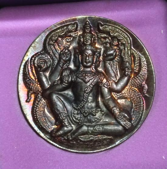 เหรียญองค์พ่อจตุคามรามเทพ "รุ่นก้าวหน้า มหาโชค มหาเศรษฐี" วัดคงคาวง (วัดอ้ายเขียว) อ.พรหมคีรี จ.นครศรีธรรมราช ปี 2550 เนื้อนวะพลายเงินวิ่งสวย มีโค้ตและหมายเลขกำกับ |