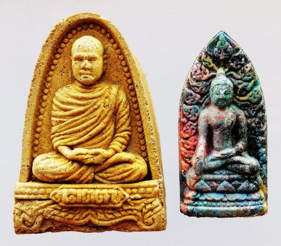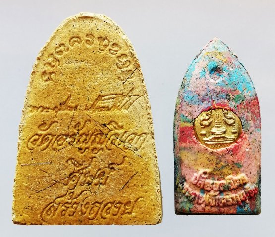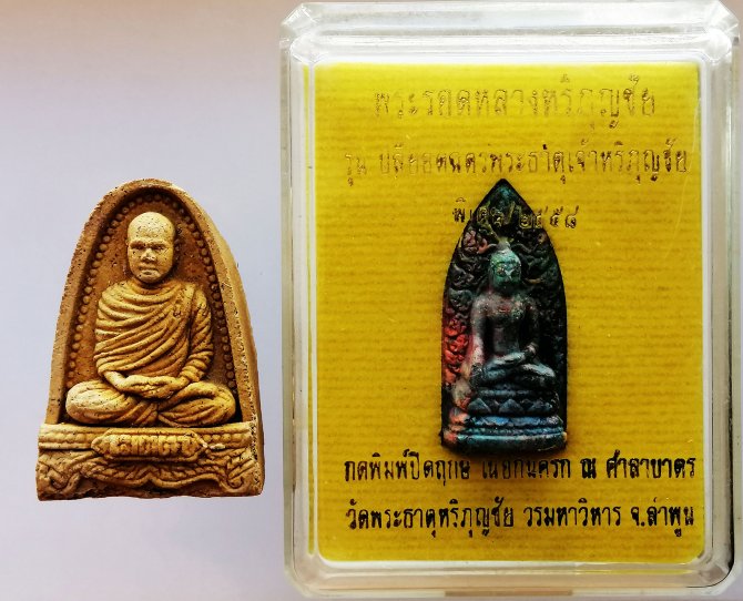 ชื่อพระเครื่อง << วัดใจ >> พระผงรูปเหมือนพิมพ์เตารีดเล็ก เนื้อสีเหลือง พระอาจารย์เปลี่ยน หลังลายเซ็น เกศา(เยอะ) + พระรอดหลวงหริภุญชัย รุ่นปลียอดฉัตรพระธาตุเจ้าหริภุญชัย "เนื้อก้นครก" แจกกรรมการ