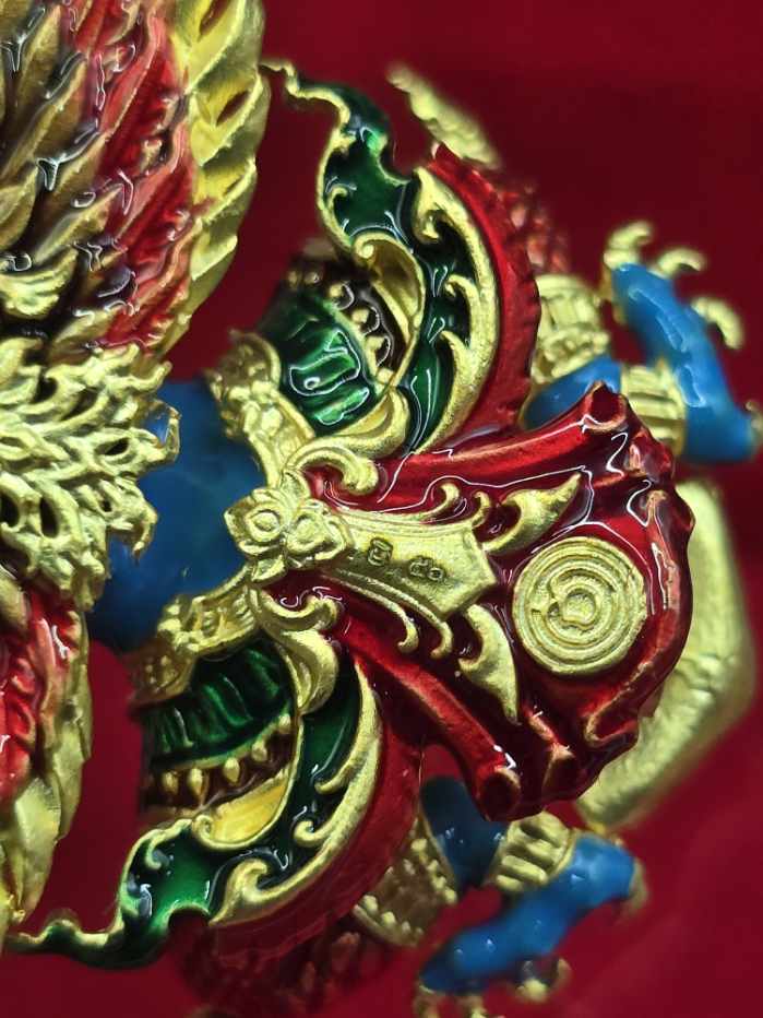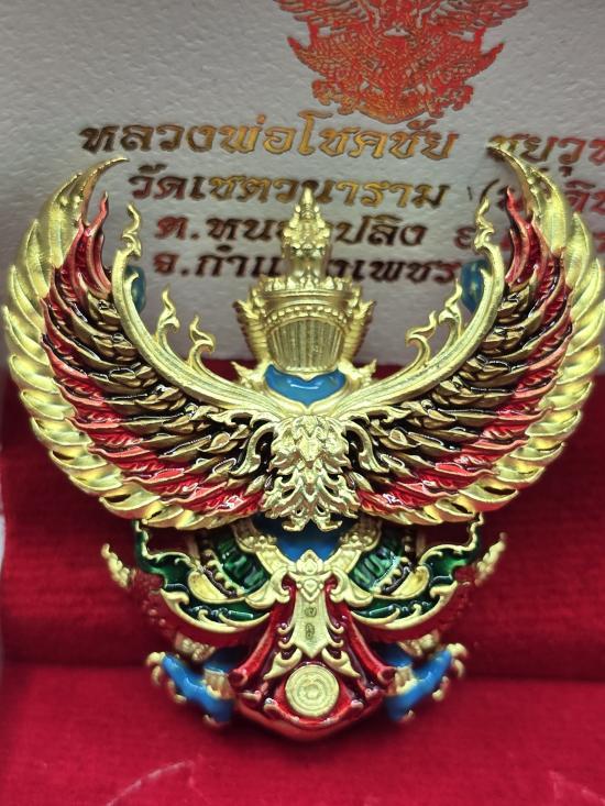 พญาครุฑ รุ่นมีโชคพันล้าน หลวงพ่อโชคชัย วัดน้ำดิบ เนื้อมหาชนวนชุบทองลงยากายฟ้า สร้าง 80 องค์ หมายเลข ๕๖ พร้อมกล่องเดิม |