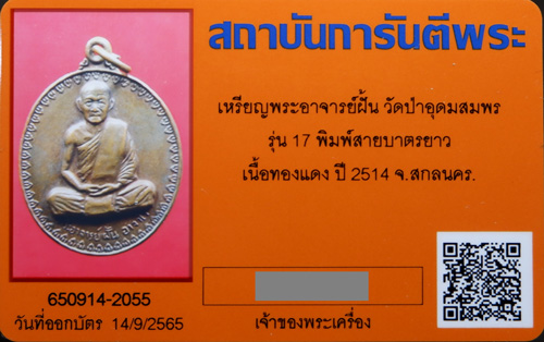 เหรียญพระอาจารย์ฝั้น อาจาโร ปี 2514 รุ่น17 เนื้อทองแดง พิมพ์สายบาตรยาว บัตรรับรอง GPra