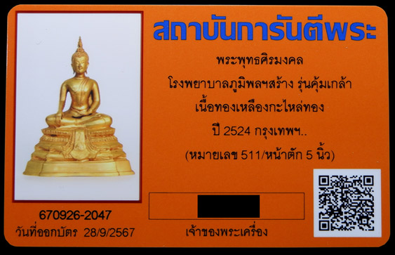 พระบูชาพุทธศิรมงคล ภปร. หน้าตัก 5นิ้ว (พระบูชา ภปร.คุ้มเกล้า) หมายเลขประจำองค์ 511 รพ.ภูมิพล ปี 2524 พร้อมบัตรรับรอง GPra