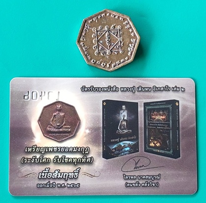 เหรียญสมนาคุณเนื้อสัมฤทธิ์ (เหรียญหล่อหลวงปู่ เดินหน อิเกสาโร รุ่นแรก เพชรยอดมงกุฎ (ระงับโศก รับโชคทุกทิศ) พร้อมบัตรรับรองหนังสือ หลวงปู่ เดินหน อิเกสาโร เล่ม 2 หมายเลข 13406 |