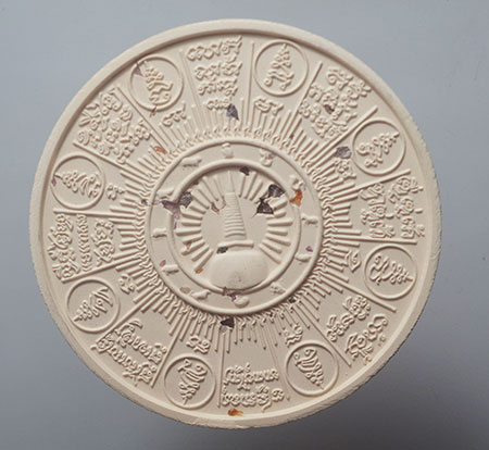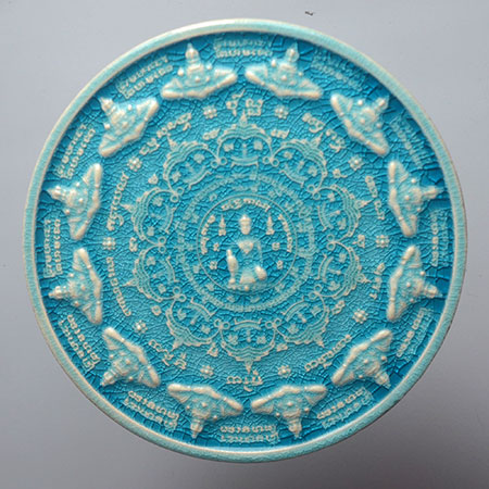 จตุคามรามเทพ รุ่น มหาเทวโพธิสัตว์สุวรรณภูมิ ปี 2550 กระเบื้องเคลือบสีฟ้า ( สีทูลเกล้า ) + เคลือบแดง หลังเจดีย์ |