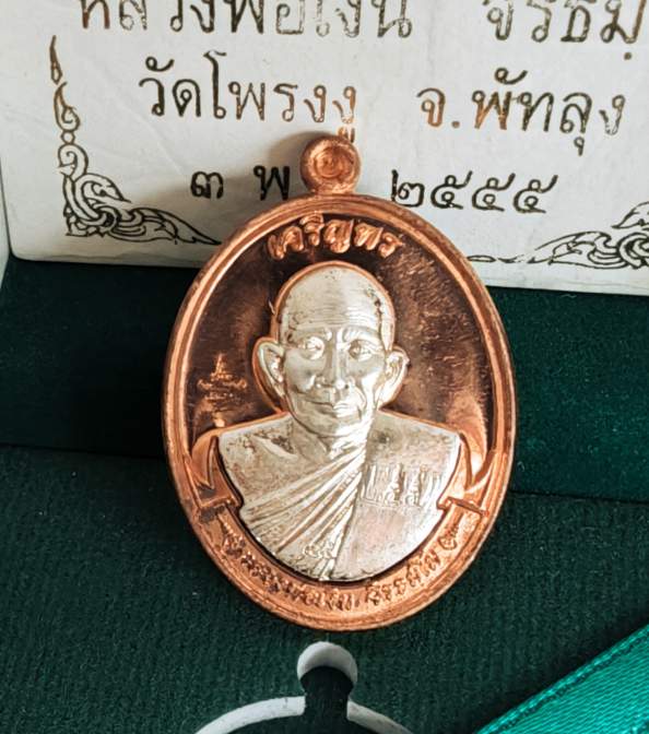 เคาะเดียวแดง เหรียญเจริญพร 55 แยกชุดกรรมการ ทองแดงผิวไฟหน้ากากเงิน หมายเลข15 หลวงพ่อเงิน วัดโพรงงู พัทลุง พร้อมกล่องกำมะหยี่ |