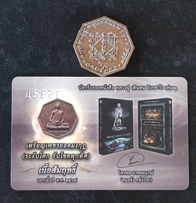 เหรียญสมนาคุณเนื้อสัมฤทธิ์ (เหรียญหล่อหลวงปู่ เดินหน อิเกสาโร รุ่นแรก เพชรยอดมงกุฎ (ระงับโศก รับโชคทุกทิศ) พร้อมบัตรรับรองหนังสือ หลวงปู่ เดินหน อิเกสาโร เล่ม 2 หมายเลข 35321 |