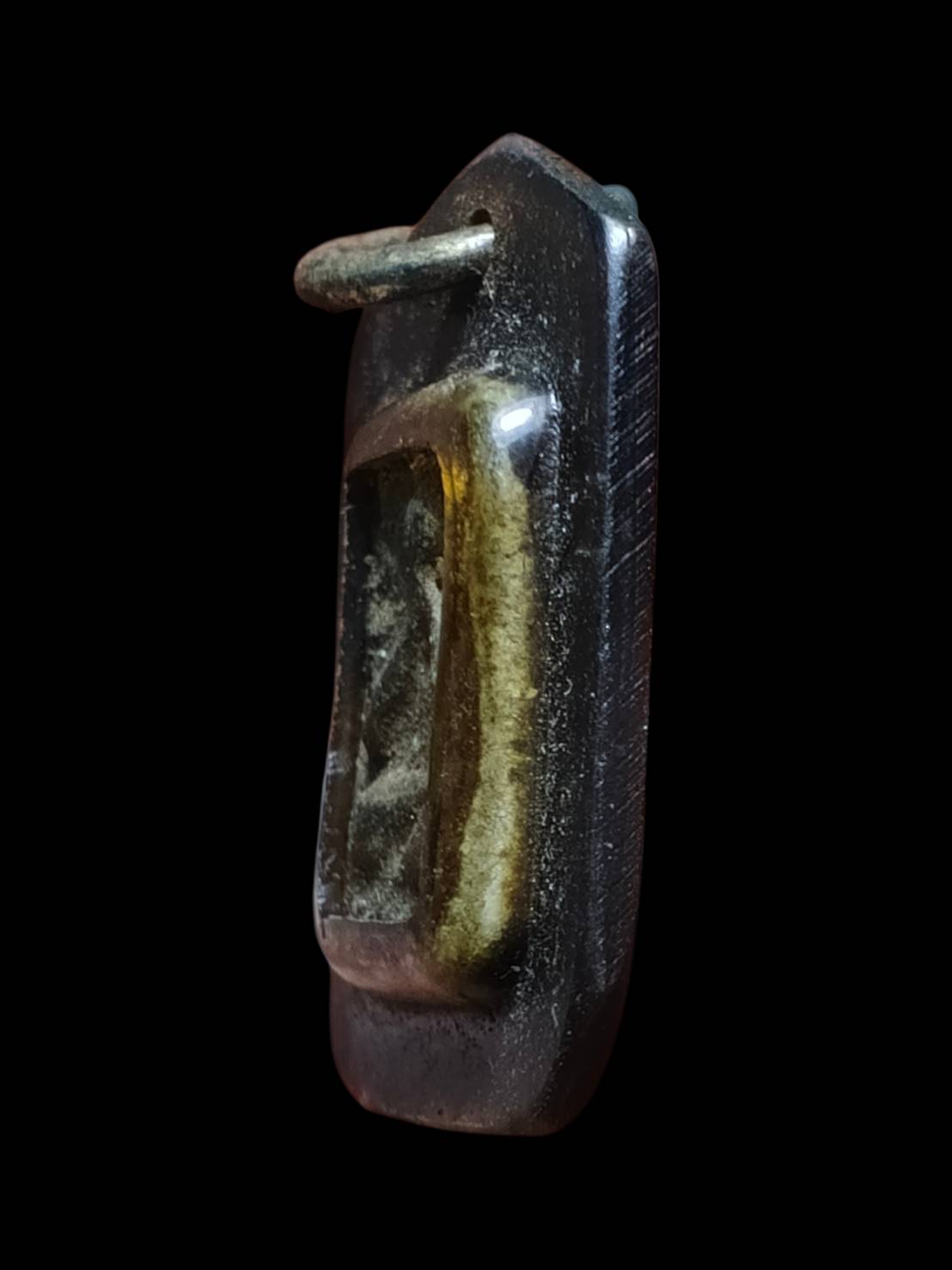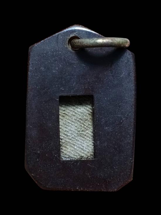 พระปิดตาเนื้อโลหะ ด้านหลังมีจาร เลี่ยมกรอบพลาสติกสีน้ำตาลเข้ม เคาะเดียวค่ะ |
