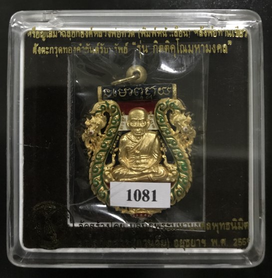 "วัดใจ" เหรียญเสมาฉลุยกองค์หลวงพ่อทวด(พิมพ์หน้าเลื่อน)หลังพ่อท่านเขียว ฝังตะกรุดทองคำยันต์รับทรัพย์ "รุ่น กิตติคุโณมหามงคล" เนื้อบรอนซ์ชุบทอง ลงยาซุ้มพญานาคฉากสีธงชาติ สภาพสวยพร้อมกล่องเดิม หมายเลข 1081