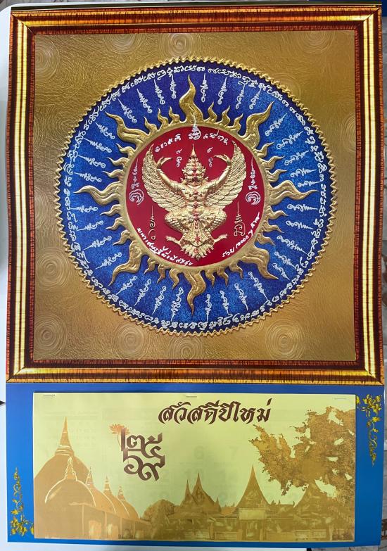 ปฎิทินปี 2569 รูปองค์พญาครุฑพื้นเหลือง อาจารย์วราห์ วัดโพธิ์ทอง บางมด ขนาดกรอบรูป 45x45 ซม. กระดาษอาร์ตการ์ด พิมพ์ 4 สี เคลือบ uv เหมาะสำหรับนำไปเข้ากรอบรูปได้ |