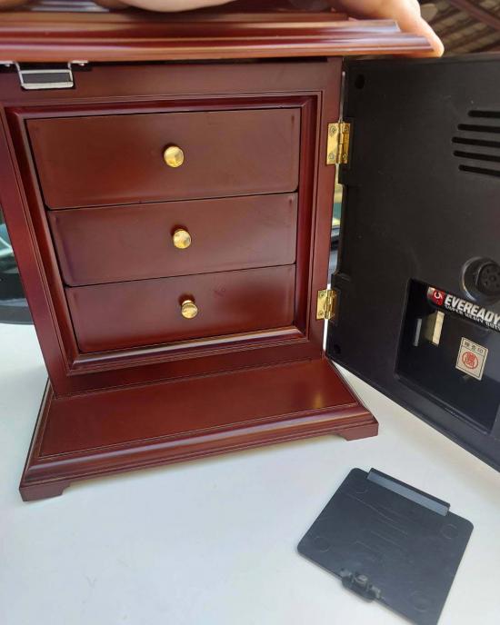 กล่องเครื่องประดับ 3 ลิ้นชัก พร้อมนาฬิกาตั้งโต๊ะ Miyabi สภาพสวย งาน Japan กว้าง 21 cm สูง 21 ใช้งานได้ปรกติ |