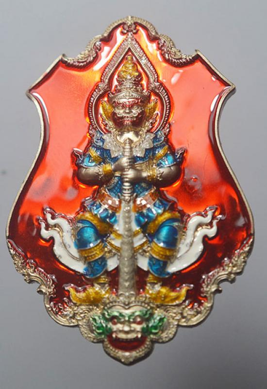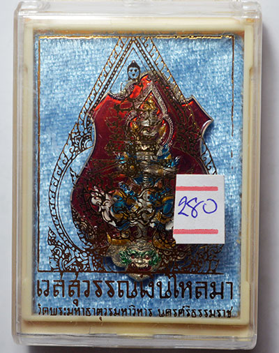 เหรียญท้าวเวสสุวรรณ รุ่น เงินไหลมา วัดพระมหาธาตุ นครศรีธรรมราช เนื้อกะหลั่ยเงิน ลงยาราชวดี พื้นแดง เลข 280