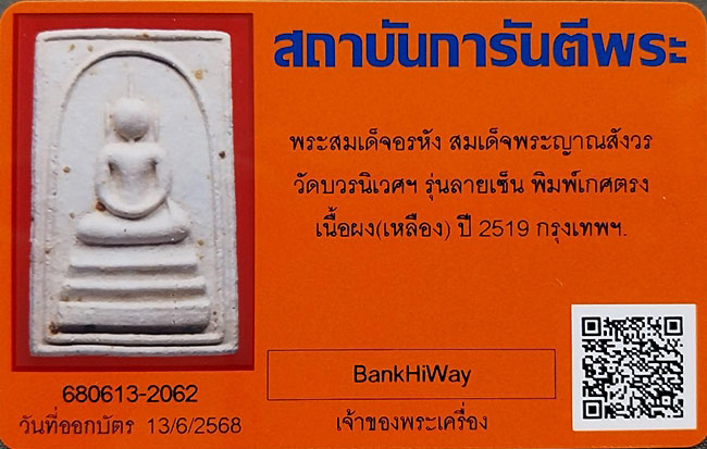 สมเด็จอรหัง สมเด็จพระญาณสังวร วัดบวรฯ หลังลายเซ็น พิมพ์เกศตรง(โต๊ะกัง) เนื้อผง(เหลือง) ปี2519 |