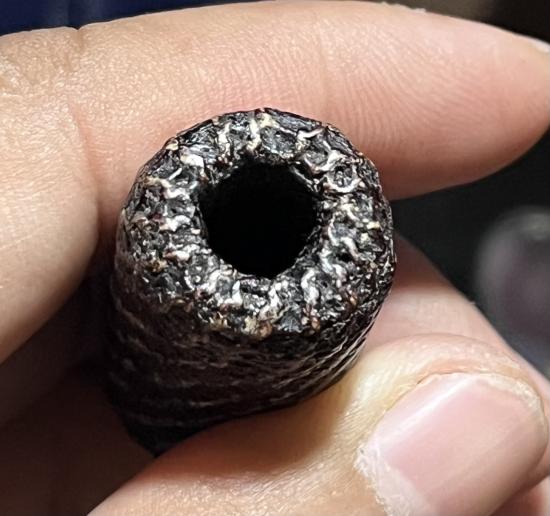 ตะกรุดถักเชือกชุบรักยาว 1.5 นิ้ว โต 1.7 ซม ไม่ทราบที่นำ้หนักเบาไม่น่าเป็นเนื้อโลหะ |