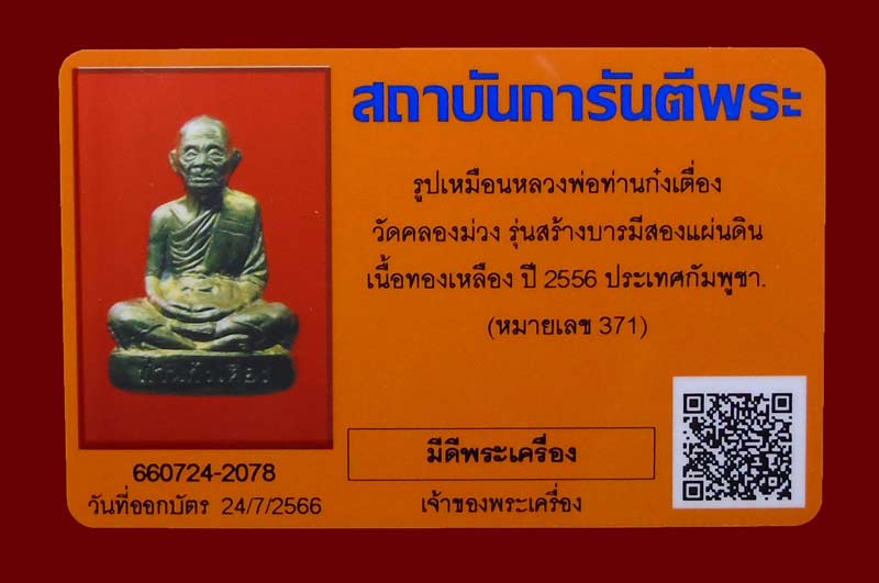 ชื่อพระเครื่อง รูปเหมือน เนื้อทองเหลือง ก๋งเตื่อง วัดคลองม่วง จ.ตราด (หมายเลข 371) ปี2556 + บัตรพระแท้