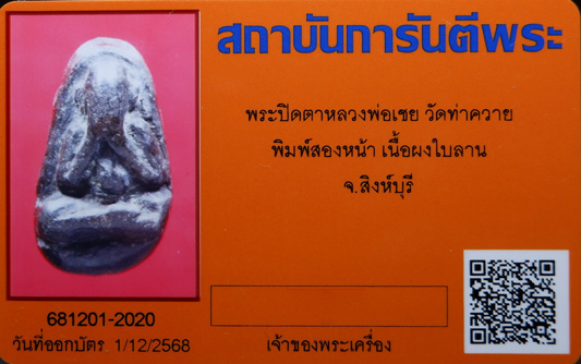 หลวงพ่อเชย มรณภาพ เมื่อปี ๒๔๖๙ สิริรวมอายุได้ ๕๗ ปี พรรษา ๓๗ องค์นี้เป็น พระปิดตาหลวงพ่อเชย พิมพ์สองหน้า พิมพ์นิยม สภาพสวยแท้ดูง่าย คมสมบูรณ์มาก