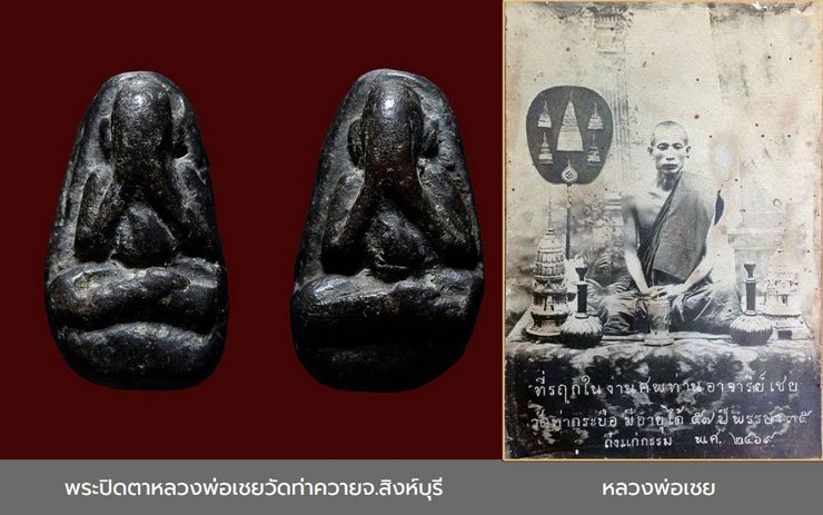 พระปิดตาหลวงพ่อเชย จัดสร้างประมาณ พ.ศ.๒๔๖๐ เป็นพระยุคเก่า สร้างด้วยผงพุทธคุณคลุกรัก และวัสดุอาถรรพณ์มากมาย มีสีดำสนิท และดำอมน้ำตาล ขัดสมาธิเพชร แบ่งออกเป็น ๒ พิมพ์ คือ พิมพ์ประกบสองหน้า และพิมพ์หน้าเดียวหลังยันต์