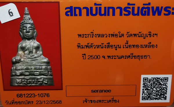 พระกริ่งหลวงพ่อโต วัดพนัญเชิง หนังสือนูน เนื้อทองเหลือง ปี2500 จ.พระนครศรีอยุธยา + บัตรG-pra สภาพสวยเดิมค่ะ |