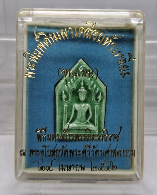 องค์นี้เป็นพระพิมพ์ขนาดจิ๋ว มีขนาด 1.7 X 2.7 c.m. เคลือบสีเขียวด้านหน้า หลังยันต์หมึก มาพร้อมกล่องเดิม