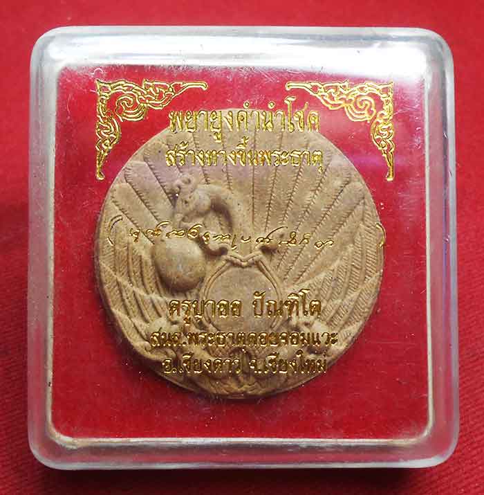 พญายูงคำ นำโชค เนื้อผงพุทธคุณ รุ่นแรก ครูบาออ ปัณฑิต๊ะ สำนักสงฆ์พระธาตุดอยจอมแวะ ต.เมืองนะ อ.เชียงดาว จ.เชียงใหม่ มีพิธีพุทธาภิเษก เมื่อวันอังคารที่ ๒๐ พฤศจิกายน พ.ศ.๒๕๕๕ ขึ้น ๗ ค่ำ เดือน ๑๒ จัดสร้างจำนวน ๒,๙๙๙ ตัว ด้านหน้าเป็นรูปนกยูงแพนหาง ปากคาบถุงเพชร เท้าซ้ายจับถุงเงิน เท้าขวาจับถุงทอง ด้านหลังเป็นยันต์ดอกแก้ว ฝังก้านธูปเสกและผ้าจีวรของท่าน โดดเด่นเรื่องโภคทรัพย์ เมตตามหานิยม โชคลาภ |