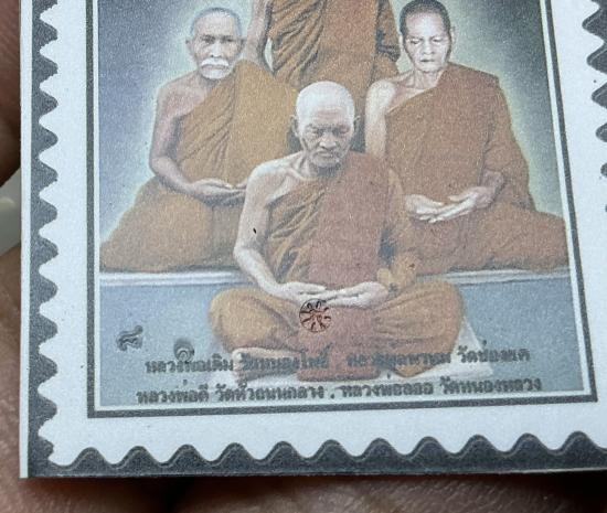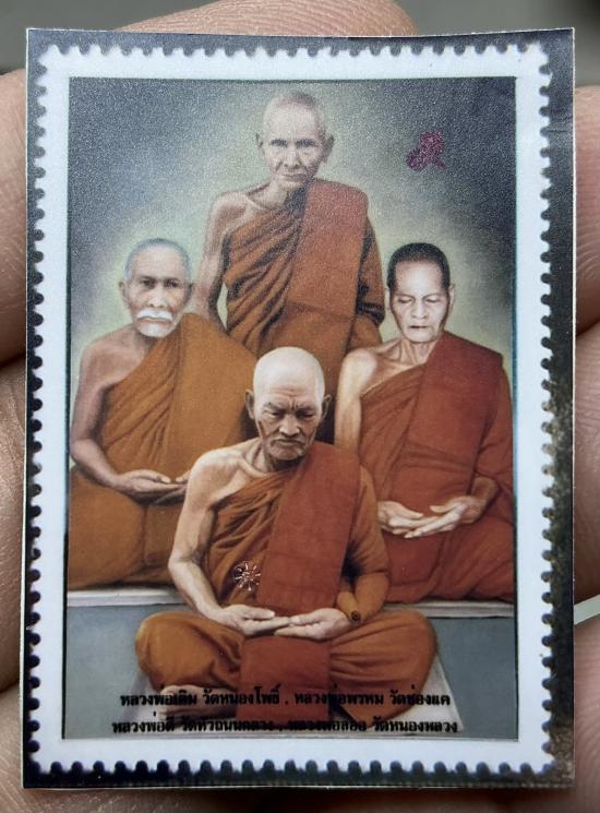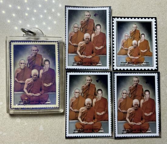 รูปหลวงพ่อลออ และอาจารย์ของท่าน 5 ใบ 1ใบเลี่ยมพาสติกกันน้ำแล้ว มีรอยจุดพินทุทุกบาน