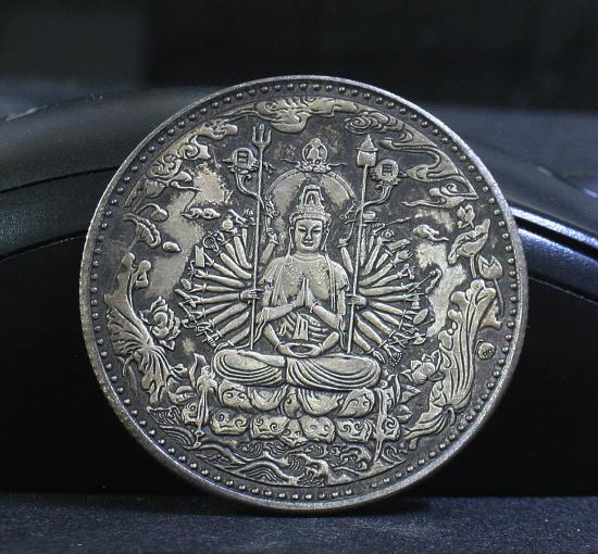 เหรียญเจ้าแม่กวนอิมพันมือ เนื้อนิเกิลผสมเงิน หลังตัวหนังสือจีน