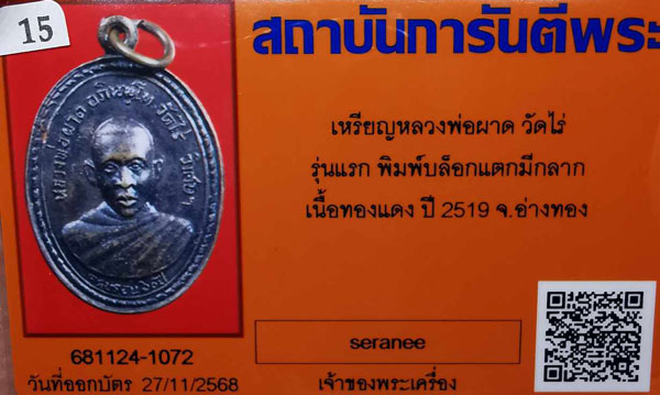 เหรียญหลวงพ่อผาด วัดไร่ รุ่นแรก พิมพ์บล็อกแตก เนื้อทองแดง ห่วงเดิม ปี2519 จ.อ่างทอง + บัตรG-pra สภาพเดิมค่ะ |
