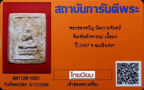 รายละเอียด พระผงวัดเกาะจันทร์ ปี2497 จ.ฉะเชิงเทรา หลวงพ่อสด วัดปากน้ำ ..สวยเดิมๆ สมบรูณ์ (หลังยันต์จารนะ นิยม) + บัตรรับรอง G-Pra