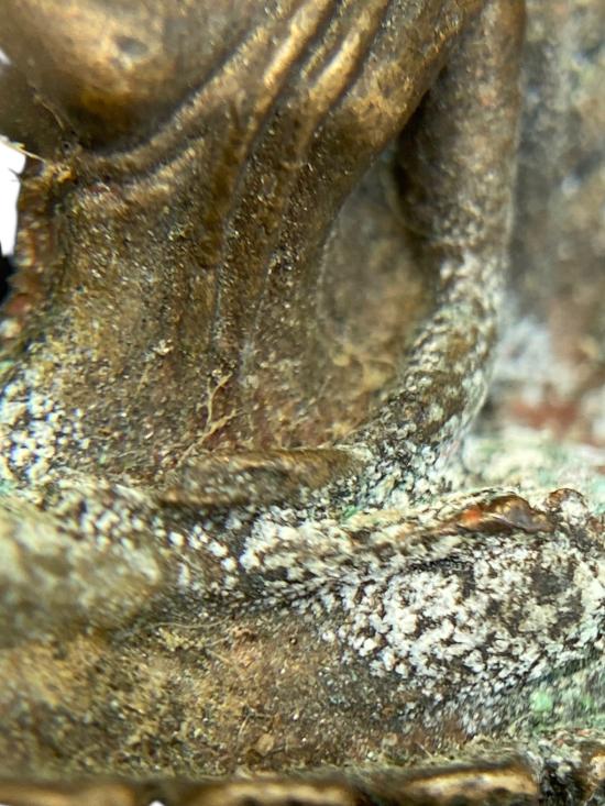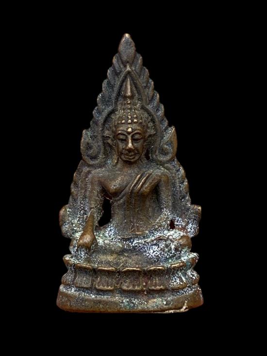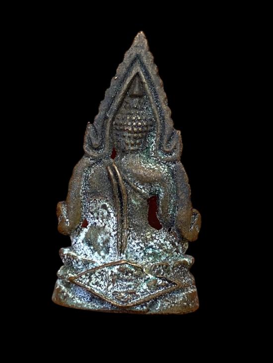 พระพุทธชินราชหล่อเนื้อโลหะ ไม่ทราบที่ประวัติ พิมพ์นั่งปางมารวิชัย ทรงชินราช ฐานบัวซ้อน รายละเอียดองค์พระคมพอสมควร ผิวโลหะเก่า มีคราบสนิมและร่องรอยการใช้งานตามอายุ ใต้ฐานเห็นรอยตะไบชัดเจน เป็นงานหล่อเก่าแท้ตามสภาพ เหมาะสำหรับสายบูชาองค์เล็ก พกติดตัว หรือเก็บเป็นพระใช้งาน ไม่เน้นสนามประกวด
