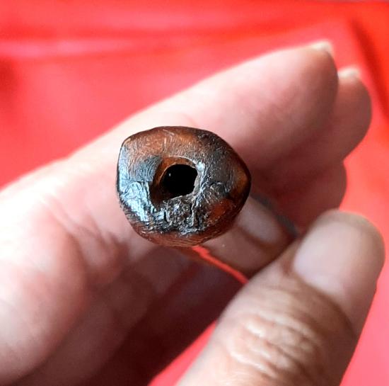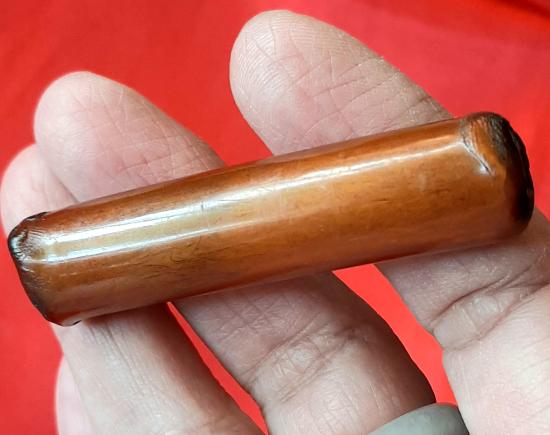 ตะกรุดหนังเสือ หุ้มด้วยพลาสติก เก่า ลนไฟ ปิดหัวปิดท้าย มีรู ไว้ร้อยเชือกแขวน |