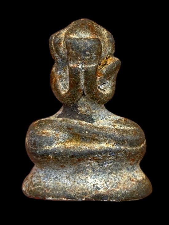 พระปิดตาเนื้อโลหะเก่า ไม่ทราบที่ พิมพ์โบราณ องค์พระนั่งปิดตาเต็มฟอร์ม สัดส่วนได้ทรง ฐานกว้างมั่นคง ผิวโลหะเก่าแท้ มีสนิมเดิมและคราบอายุขึ้นตามธรรมชาติ เห็นร่องรอยการใช้งานจริง ไม่ผ่านการขัดแต่ง รายละเอียดเส้นสายยังพอเห็นชัด เป็นพระสายใช้งานที่นิยมพกติดตัว เน้นความขลังและพุทธคุณ