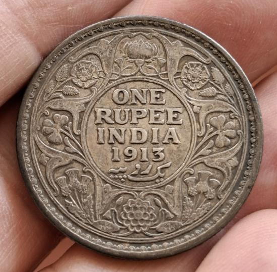 เหรียญเงินหนึ่งรูปีอินเดีย (British India One Rupee) ปี ค.ศ. 1913 ซึ่งออกใช้ในรัชสมัยของสมเด็จพระเจ้าจอร์จที่ 5 (King George V)