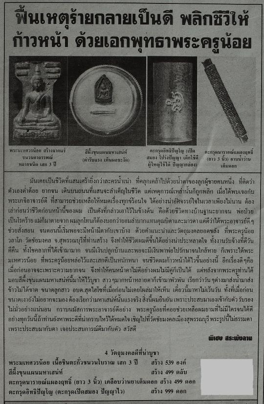 สุดยอดของดีที่พระครูปลุกเสกนานถึง 3 ปี เรียกว่าพุทธคุณเข้มข้นทุกอณู ลงอิทธิเวทย์ศาสตร์พระคาถาเข้มขลังทุกรูขุมขน ด้วยมหามนต์กลวิชาสารพันลึก ผนึกยอดวิชามหาพุทธาคมอันเสกสมเพาะบ่มไว้เนิ่นนาน โดยหล่อตามตำราโบราณ ด้วยมวลสารยอดฤทธิ์สุดอาถรรพณ์ชั้นครู เทชนวนฟ้าลั่น ปลุกเสกฟ้าคำรณ ว่ามนต์ฝนโปรยปรายดั่งได้น้ำพระพุทธมนต์จากเทวดาบนสรวงสวรรค์ พระครูว่า ครูบาอาจารย์ เทวดาฟ้าดินท่านรับรู้ หากใครได้มีไว้บูชา จะไม่พบกับคำว่าย่ำแย่กันอีกเลย ก็เห็นเป็นดังจริงที่พระครูว่า เพราะเมื่อก่อนหลังจากเสกได้ประมาณหนึ่งปี พระครูก็ได้นำมาแจกผู้ใจบุญ ที่มาทอดกฐินก็ดี ผ้าป่าก็ดี จนเกิดประสบการณ์ดีต่างๆนานากันสนั่นทุ่ง ทั้งเจริญรุ่งเรืองกันบ้างล่ะ ค้าขายดีเป็นเทน้ำเทท่าบ้างล่ะ แคล้วคลาดปลอดภัยพ้นจากอันตรายทั้งปวงบ้างล่ะ จนเป็นที่เสาะหากันมาช้านาน ด้วยประสบการณ์อันลือลั่น หลังจากนั้นพระครูเก็บปลุกเสกพระมเหศวรน้อยที่เหลือเงียบๆในกุฏิ อยู่นานร่วม 3 ปี เพิ่มเสริมมหามนต์เร่งผลส่งฤทธิ์เร็วไวให้มากขึ้น มีดีมากค่าเป็นทวีคูณ พุทธคุณพระมเหศวรน้อยนั้นไซร้ ตำราท่านว่าไว้ มีดีให้คุณในเรื่องแคล้วคลาด คงกระพันแลชาตรี ชนะไพรีแม้มีเป็นแสนก็แพ้พลพ่ายให้กลับไป อีกทั้งพระครูยังเสริมเติมใส่สรรพวิชาแห่งความเจริญสำทับเอาไว้ด้วย เพิ่มให้มีพุทธาอานุภาพในด้านทำมาหากินคล่อง ดำเนินกิจการอันใดก็เจริญรุ่งโรจน์ บังเกิดสิ่งดีๆเข้ามาในชีวิตอย่างไม่มีที่สิ้นสุด เมื่อได้มีพระมเหศวรน้อยนี้ไว้บูชา พระมเหศวรน้อยที่ปลุกเสก 3 ปี เหลือเท่าที่นับได้จำนวน 539 องค์