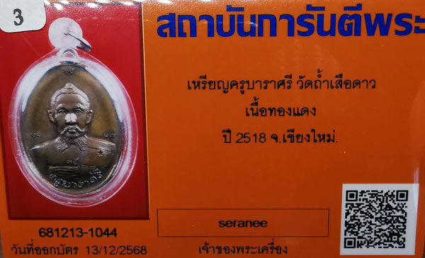 เหรียญครูบาราศรี วัดถ้ำเสือดาว เนื้อทองแดง ปี2518 จ.เชียงใหม่ + บัตรG-pra สภาพเดิมค่ะ