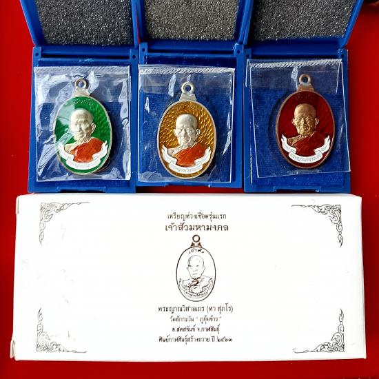 เหรียญห่วงเชื่อม รุ่นแรก "เจ้าสัว มหามงคล" พระญาณวิสาลเถร (หลวงปู่หา สุภโร) หรือ หลวงปู่ไดโนเสาร์ วัดสักกะวัน(ภูกุ้มข้าว) อ.สหัสขันธ์ จ.กาฬสินธุ์ ปี ๒๕๖๓ ชุดกรรมการ ๓ เหรียญ เนื้อนวะโลหะ คุ้ยพื้นลงยาสีเขียว, เนื้ออัลปาก้า คุ้ยพื้นลงยาสีเหลือง, เนื้อชนวนมวลสาร คุ้ยพื้นลงยาสีแดง ด้านหลังตอกโค๊ต เลข ๗๔ เลขสองหลัก คัดเก็บผิวสวยเดิม จมูกโด่ง (สร้างน้อย ๑๙๙ ชุด) พร้อมกล่องเดิมครับ สวยงาม น่าสะสมบูชามากๆ