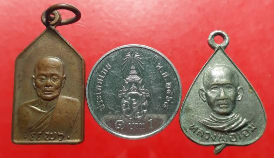 เหรียญหลวงพ่อแพว+หลวงพ่อเอม ระยอง เนื้อทองแดง+กะไหล่เงิน เคาะเดียวแดง
