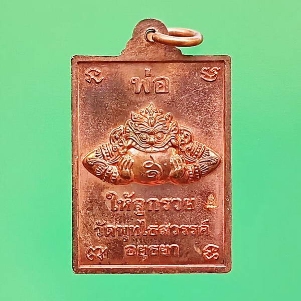#2 ผิวสวยเดิมๆ เหรียญแสตมป์องค์จตุคามรามเทพ ทวิภพสองแผ่นดิน พ่อให้ลูกรวย วัดพุทไธศวรรย์ เนื้อทองแดง ปี 2549 เนื้อทองแดง จำนวนสร้าง 30,000 เหรียญ ตอกโค๊ด พระปรางค์ ด้านหลังเหรียญ ใต้แขนซ้ายราหู หลังคำว่า ให้ลูกรวย