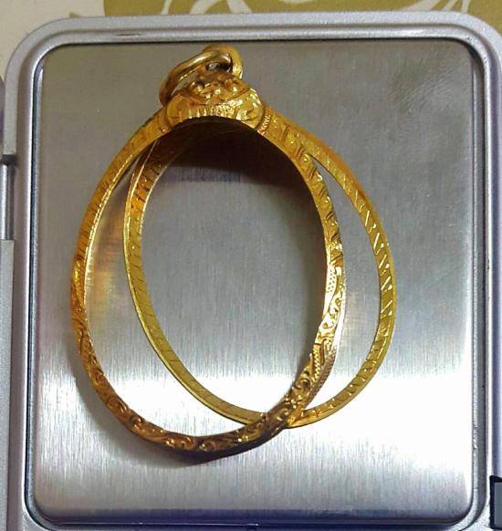 กรอบทองคำแท้ ทรงเหรียญรูปไข่ ยกซุ้มหัวสิงห์ น้ำหนักประมาณ 4.9 กรัม เปอร์เซ็นสูง 83.34%