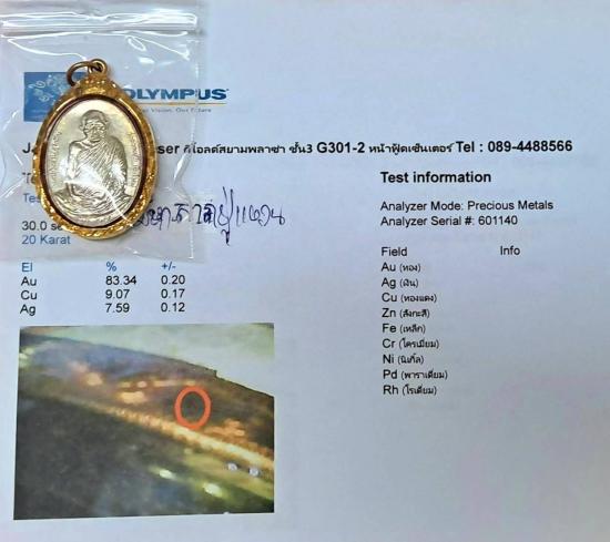 กรอบทองคำแท้ ทรงเหรียญรูปไข่ ยกซุ้มหัวสิงห์ น้ำหนักประมาณ 4.9 กรัม เปอร์เซ็นสูง 83.34% |
