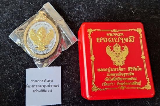 เหรียญพญาครุฑ หลวงปู่ศิลา วัดโพธิ์ศรีสะอาด รุ่นยอดบารมี ลังนำฤกษ์ เนื้อชนวน หน้ากากทองทิพย์ ลงยาพื้นขาว เลี่ยมกรอบชุบน้ำทอง No.25 |