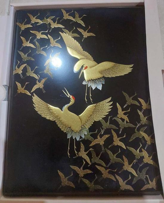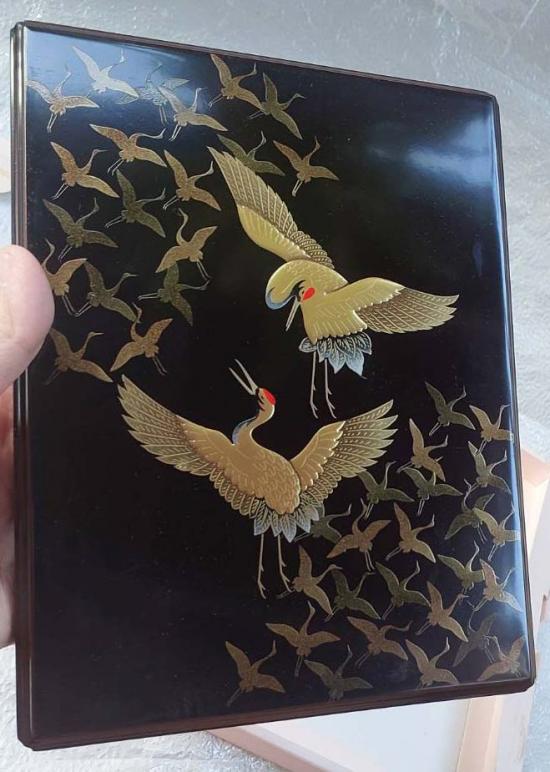 ฝากล่องประดับด้วยลวดลาย (นกกระเรียน) คู่ที่กำลังบินด้วยเทคนิคมาคิเอะ (Maki-e) หรือการวาดลวดลายด้วยผงทอง