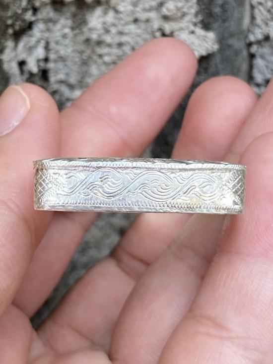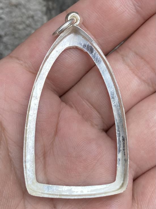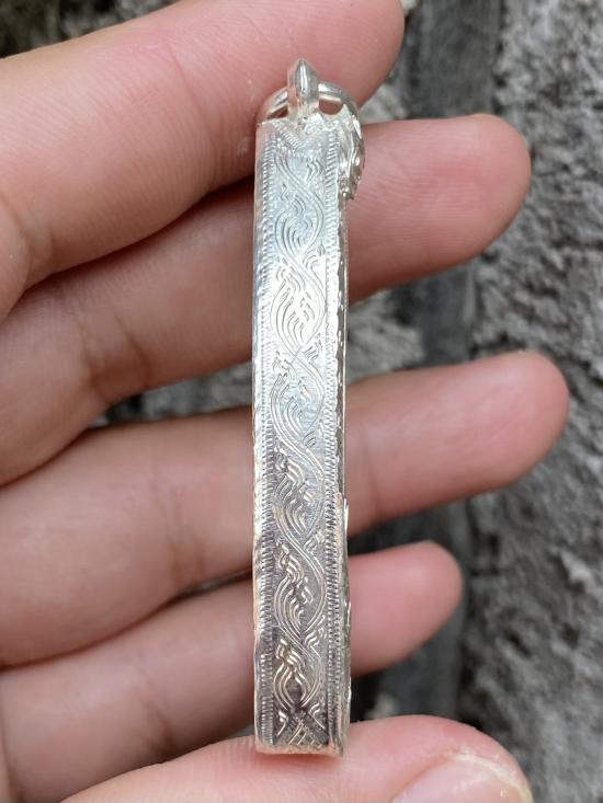 กรอบเงินแท้ สั่งทำมือ 2 เลี่ยมกันน้ำแล้วแกะออกไม่เคยผ่านการใช้ผ่านการคล้อง สภาพกรอบ 99% ไม่มีฉีดขาด |