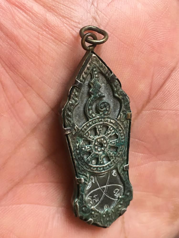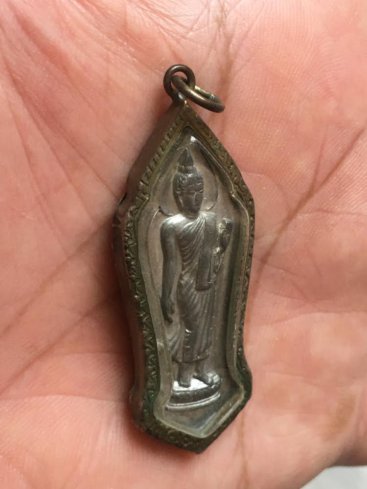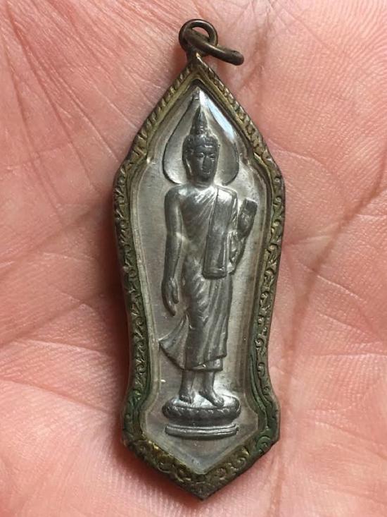 เหรียญพระพุทธ 25 ศตวรรษ เนื้อชินตะกั่ว ปี 2500 พิมพ์ไม่มีเข็ม เลี่ยมเก่ากรอบเดิมจากวัด สภาพค่อนข้างสมบูรณ์ ด้านหลังมีคราบจากการใช้และเก็บเดิมมาบ้างเล็กน้อย