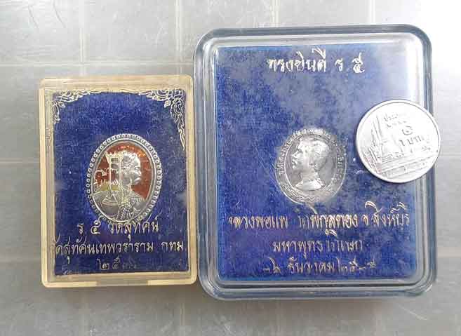เหรียญร.5 เนื้อเงินลงยา วัดสุทัศน์ + เหรียญร.5 เนื้อเงินหลวงพ่อแพ วัดพิกุลทอง กล่องเดิม