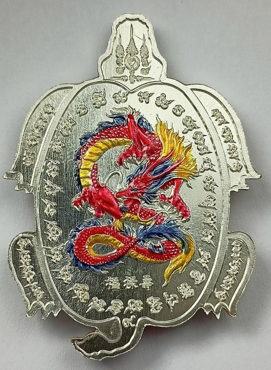เหรียญ เต่ามังกรปลดหนี้ หลวงปู่เฮง ปภาโส วัดพัฒนาธรรมาราม จ.สุรินทร์ เนื้อเงินลงยา 3 สี เบอร์ 92 พร้อมกล่องเดิมครับ (เหรียญหนัก 30.91 กรัม)