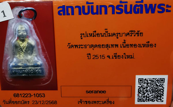 ชื่อพระเครื่อง รูปเหมือนครูบาศรีวิชัย วัดพระธาตุดอยสุเทพ เนื้อทองเหลือง ปี2515 จ.เชียงใหม่ + บัตรG-pra สภาพสวยเดิมค่ะ